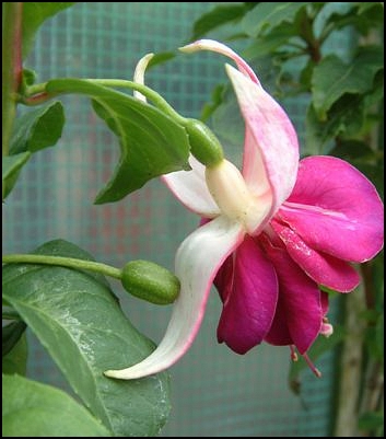 ‘Herps Kolos’ – No 7702 (Waldenmaier 2011) Double. Upright. COROLLA: three quarter flared, round shape, smooth petal margins; opens purple (77A); matures purple (80A); 35mm (1 3/8") long x 35mm (1 3/8") wide. SEPALS: fully up, tips recurved; white (155A) upper surface; white (155A) maturing with pink spots lower surface; 55mm (2 3/16") long x 15mm (9/16”) wide. TUBE: white (155A) striped pink; short, medium thickness; 12mm (7/16”) long x 7mm (1/4”) wide. STAMENS extend 20mm (3/4”) beyond the corolla; dark rose (71D) filaments & anthers. PISTIL extends 25mm (1”) beyond the corolla; pale rose (73D) style; pale yellow (2D) stigma. BUD: Elongated. FOLIAGE: dark green (137A) upper surface; medium green (138A) lower surface. Leaves are 65mm (2 9/16") long x 45mm (1 3/4”) wide, ovate shaped, wavy edges, acute tips, rounded bases. Veins, stems & branches are red. PARENTAGE: ‘Herps Spencer’ x ‘White Water’. Medium upright. Makes good upright. Prefers overhead filtered light. Best bloom & foliage color in filtered light. Tested 3 years in Herpen, The Netherlands. Fuchsia Nieuwigheden Certificering. Distinguished by flower size & color. |